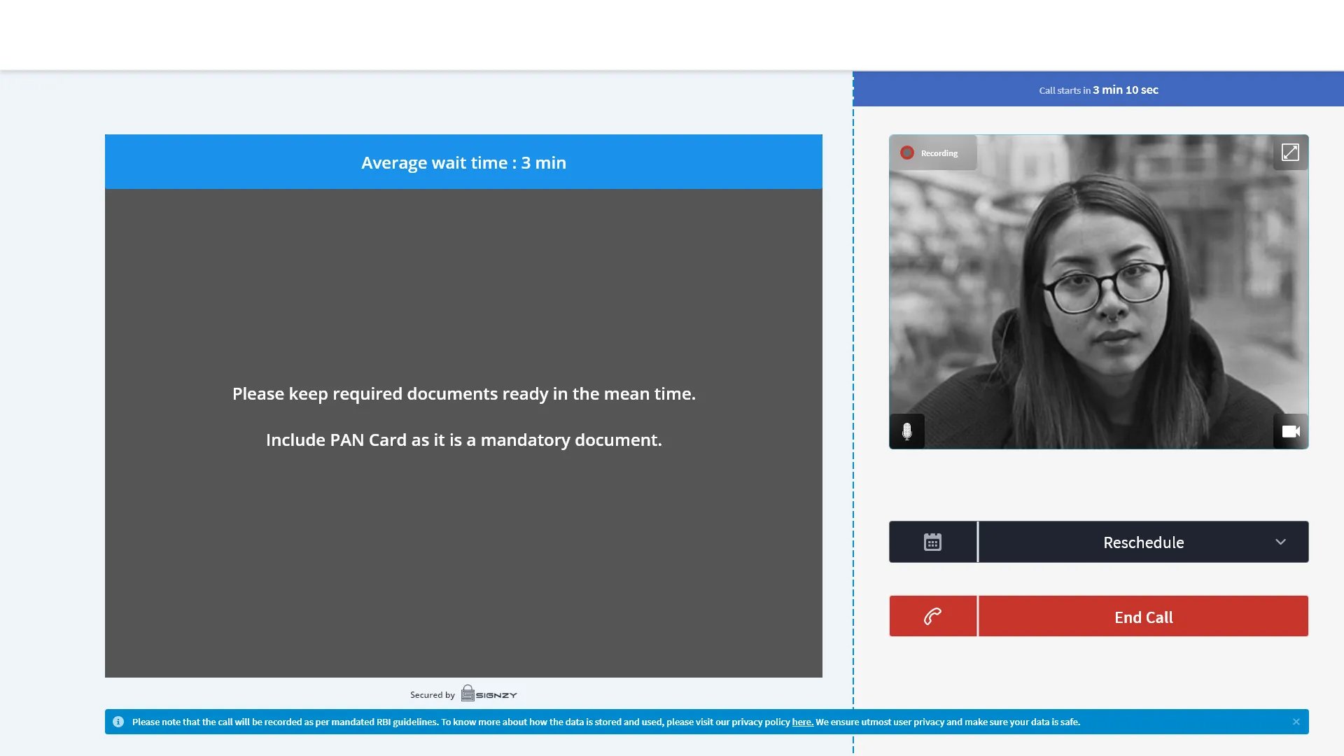 As soon as the user completes the application, he will be asked to schedule video verification slot or wait for a few minutes to connect to the next available slot. Once the video verification is done, this video data will be saved and sent along with the application to the backops user for verification. The backops user takes a right decision based on all the available data and the video verification data.